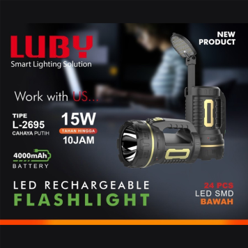 Senter Luby tipe L-2695 Keunggulan Produk : – LED Emergency 15Watt + 24SMD LED – Menggunakan baterai cas ulang lead-acid 4volt 4000 mAh – Menggunakan baterai yg awet, dapat dicas ulang lebih dari 500 kali. – Menggunakan 15W +24SMD LED yg sangat terang, hemat energi dan tahan lama. – Tahan Hingga 10 Jam – Dengan 2 Mode pencahayaan Terang Dan Lampu Belakang Senter – Diameter Senter 11cm – Panjang 21X10X11CM – Senter Dengan 1 Super LED – Jarak cahaya 1500 Meter – Dapat di isi ulang – Dilengkapi Proteksi kelebihan cas –