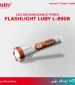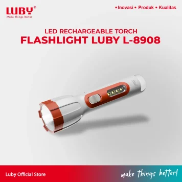 Senter Luby tipe L-8908. Memiliki keunggulan baterai isi ulang yang berkapasitas 500mAh, mudah perawatannya, dan tahan lama.